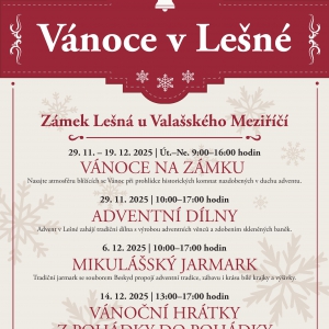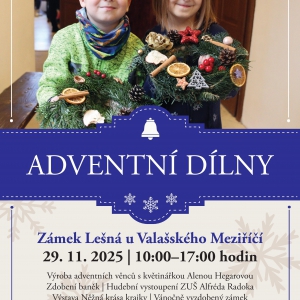 Zpomalte v hektickém předvánočním tempu a přijďte si užít začátek adventu na zámku Lešná u Valašského Meziříčí. V sobotu 29. listopadu od 10:00 do 17:00 hodin Vás čekají oblíbené dílny, ve kterých si vytvoříte vlastní adventní věnec pod dohledem floristky Aleny Hegarové a nazdobíte ručně vyráběné baňky ze vsetínské firmy IRISA. Zážitek ještě znásobí prohlídka vánočně vyzdobených historických interiérů, vystoupení ZUŠ Alfréda Radoka Valašské Meziříčí či kouzelná výstava Něžná krása krajky. Občerstvení zajištěno.