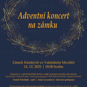 Spojení výjimečného hudebního zážitku a kouzelné atmosféry blížících se Vánoc nabídne adventní koncert pedagogů ZUŠ Alfréda Radoka ve Valašském Meziříčí Daniela Poledňáka a Anny Gavendové, který se uskuteční v neděli 14. prosince na zámku Kinských ve Valašském Meziříčí. Začátek je v 18 hodin. Účastníci přednášky Žerotínova ulice objektivem času, která bude koncertu od 16:00 hodin předcházet, mají vstup zdarma.