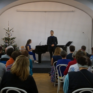 Návštěvníci koncertu se mohou těšit na krásné melodie adventních, duchovních i lidových písní v podání pedagoga sólového zpěvu Daniela Poledňáka, jehož doprovodí na klavír jeho kolegyně ze ZUŠ Alfréda Radoka Anna Gavendová. Jedinečný hudební zážitek ještě zintenzivní příběhy z městečka Krásna na počátku minulého století, které bude (nejen) z knihy Leopolda Christa Městečko mých vzpomínek předčítat Karel Straka.