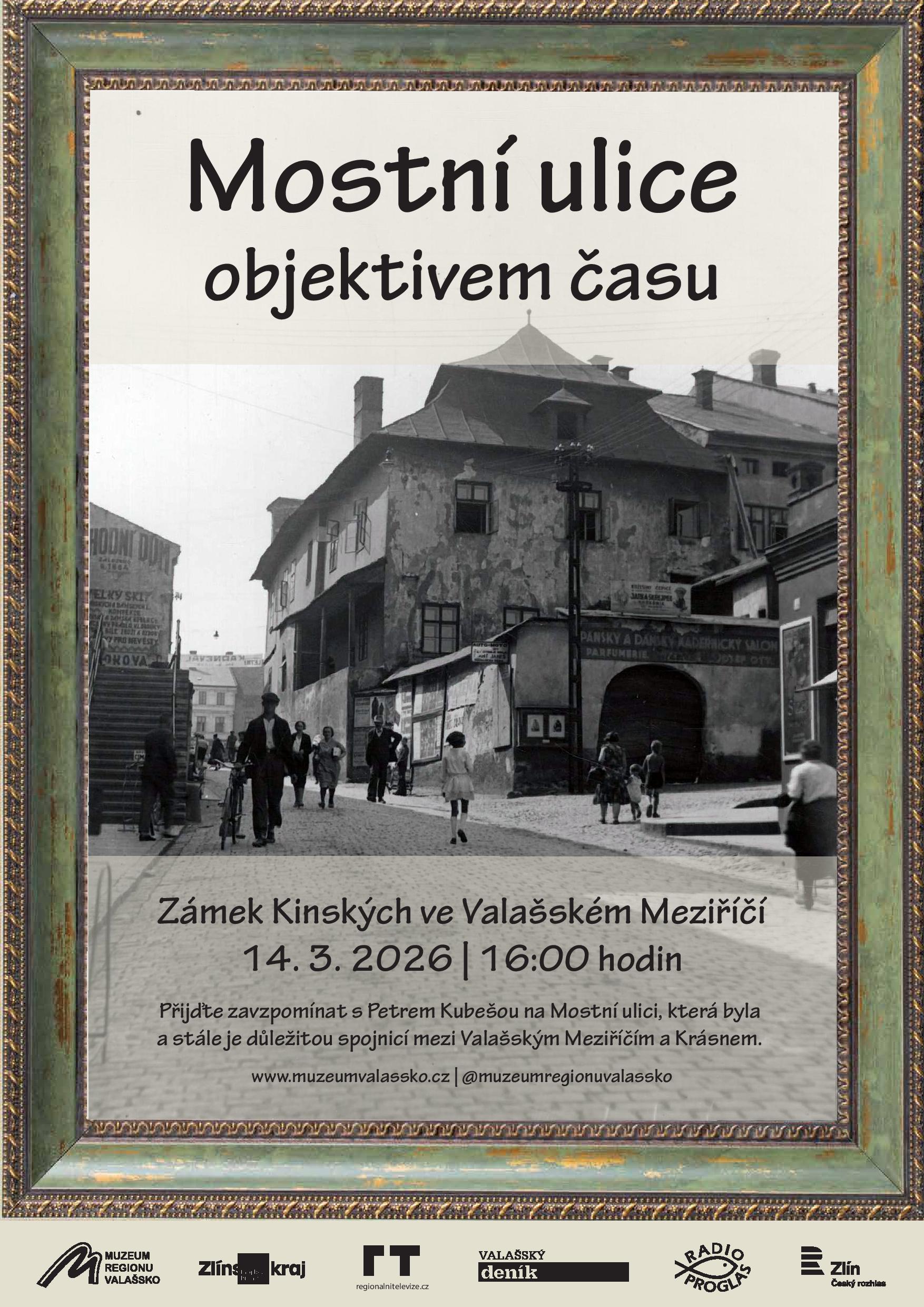 Na další výlet zpět v čase do historických ulic města pozve letošní první beseda z cyklu Valašské Meziříčí objektivem času. Na zámku Kinských si v sobotu 14. března od 16 hodin připomeneme historickou podobu ulice Mostní. Průvodcem nám bude jako obvykle sběratel historických fotografií Petr Kubeša.