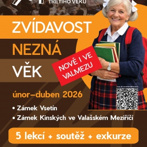 Na základě velkého úspěchu pilotního semestru z loňského podzimu pro Vás připravujeme pokračování Akademie třetího věku s Muzeem regionu Valašsko. Projekt pro seniory, kteří chtějí trávit čas smysluplně a mají chuť poznávat nové věci, se rozjede od února nejen na zámku Vsetín, ale nově i na zámku Kinských ve Valašském Meziříčí. Čeká Vás 5 tematických setkání s muzejními odborníky, kteří Vás zavedou do světa historie, umění, přírody i regionálních zajímavostí. Připravujeme také exkurzi dle vlastního výběru účastníků a také závěrečnou soutěž, která hravou formou prověří jejich nově nabyté znalosti. To vše v příjemné atmosféře a kolektivu vrstevníků. Zájemci se mohou hlásit už teď buďto prostřednictvím e-mailu ostranska@muzeumvalassko.cz nebo telefonicky na čísle 776 202 254. Staňte se součástí komunity, kde je věk největší výhodou, a užijte si s námi příjemné chvíle plné poznání, zábavy a přátelských setkání.