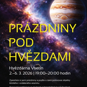 Mimořádná večerní pozorování proběhnou v době jarních prázdnin místních škol na Hvězdárně Vsetín. Akce bude zaměřena především na pozorování největší planety Sluneční soustavy Jupiteru, ale i vybraných jasnějších objektů ze vzdáleného vesmíru. Upozorňujeme, že pozorování daný den probíhá pouze za vhodných podmínek. O případném zrušení Vás budeme informovat nejpozději hodinu před plánovaným začátkem na Facebooku Muzeum regionu Valašsko (@muzeumregionuvalassko)