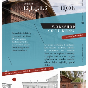 Workshop určený pro rodiny s dětmi povede edukátorka Jitka Petřeková ze spolku HORIZONT VAM z. s., která se interpretací architektury a památkové péče dlouhodobě zabývá. Díla z workshopu budou vystavena v rámci přednášky architekta Ondřeje Tučka Revitalizace nádraží Praha – Bubeneč (Stanice 6). Přednáška se koná ve středu 19. listopadu od 17 hodin v zámku Kinských ve Valašském Meziříčí (více ZDE)