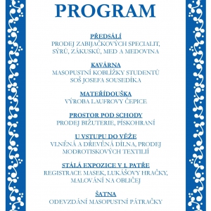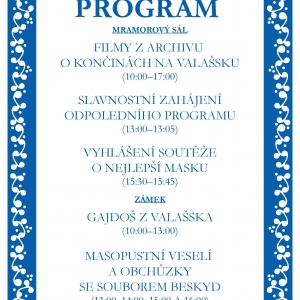 Dopolední program zpříjemní hudebním vystoupením Gajdoš z Valašska. Odpolení fašankovou obchůzku a výuku tanců předvede Valašský soubor písní a tanců Beskyd Zubří.