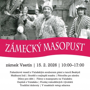 Den plný fašankových tradic, vystoupení, dobrot a zábavy pro všechny generace nabídne další ročník oblíbené akce Zámecký masopust, který proběhne v neděli 15. února v Muzeu regionu Valašsko na zámku Vsetín. Folklorní pásmo letos obstará známý Valašský soubor písní a tanců Beskyd ze Zubří. Chybět nebude oblíbená pátračka po zámku či dětský karneval se soutěží o nejlepší masku, ve které se hraje o 5 vstupenek do zábavného centra Džungle Vsetín. Návštěvníci v karnevalových maskách navíc mají vstup zdarma. Cukrářky ze SOŠ Josefa Sousedíka Vsetín Vám přímo na místě upečou tradiční koblihy. Dorazí i další prodejci s různými regionálními pochutinami a rukodělnými výrobky. Na děti čekají tvůrčí dílny a další atrakce. Dospělé by zase určitě mohly zajímat dokumentární filmy o historii masopustu na Valašsko. Zkrátka a dobře, bude toho hodně. Tož donděte.