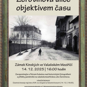 Na další výlet zpět v čase do historických ulic města pozve čtvrtá letošní beseda z cyklu Valašské Meziříčí objektivem času. Na zámku Kinských si v neděli 14. prosince od 16 hodin připomeneme historickou podobu ulice Žerotínova. Účastníci mohou využít vánoční bonus v podobě 50 procentní slevy na navazující Adventní koncert.