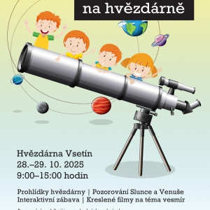 Events and Exhibitions Podzimní prázdniny na hvězdárně 28. 10. 2025 - 29. 10. 2025 Vsetín Observatory The event starts in 09:00 Photo Gallery Download the photogallery in a zip file Download PLAKÁT - Podzimní prázdniny na hvězdárně 2025 (pdf) Curator Ing. Martin Leskovjan
