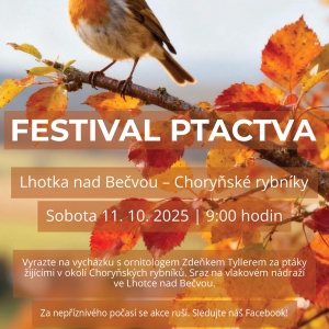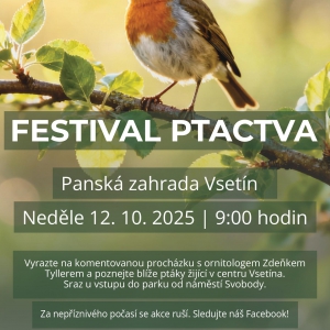 Spojení pohodové procházky s poznáním života opeřenců žijících v našem okolí nabízí tradiční Festival ptactva. V sobotu 11. října se můžete vydat se zoologem Muzea regionu Valašsko Zdeňkem Tyllerem k Choryňským rybníkům, v neděli 12. října do Panské zahrady v centru Vsetína.